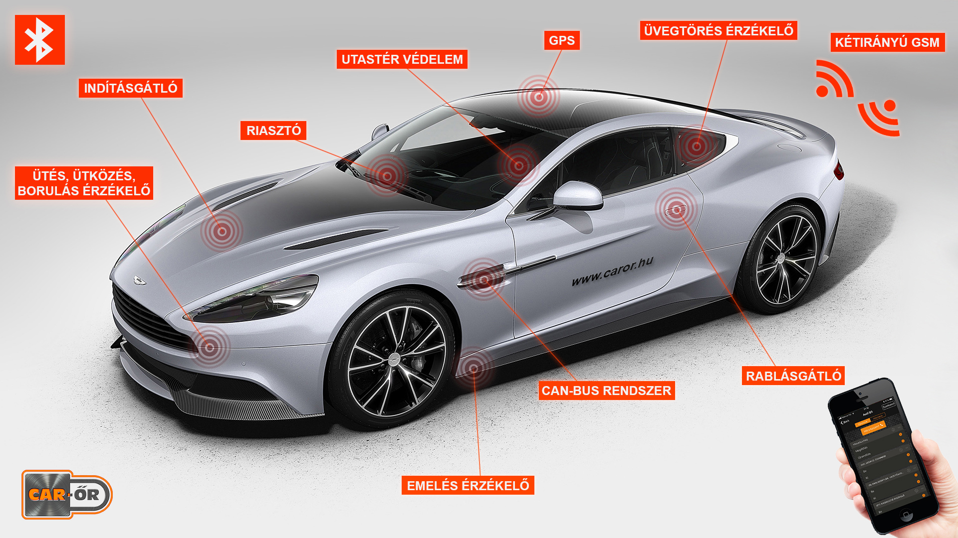 - A legmodernebb Bluetooth alapú technológiával működő rablásgátlás a CAR-ŐR gépjárművédelem esetén szerves része a csomagjainknak. Az indítókulcs vagy annak jelének másolása, ellopása esetén is védi az autót.